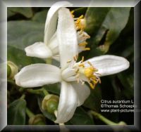 Botanische Beschreibung der Stammpflanze: Kleiner, bis 5 m hoher Baum, seltener ein Strauch. Blätter gestielt, Blattstiel im oberen Teil schwach aber deutlich geflügelt, Blattspreite ledrig und ganzrandig. Blüten meist zwittrig, radiärsymmetrisch und kräftig duftend. Kronblätter weiß, in der Regel 5, zuweilen bis 8. Staubblätter zahlreich, mit weißen, im unteren Teil zu breiten Bändern verwachsenen Staubfäden und gelben Staubbeuteln. Fruchtknoten oberständig, mit einem Griffel und einer dicken, kopfigen Narbe. Mehrfächrige, meist kugelige oder etwas platt gedrückte, in der Regel orange gefärbte Beerenfrucht von recht unterschiedlicher Größe. |