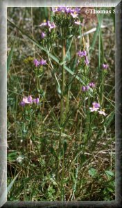 Botanische Beschreibung der Stammpflanze: Von Juli bis September blühendes, 10 bis 50 cm hohes, zweijähriges Kraut. Der Wurzel entspringt in der Regel ein einzelner Stengel, im oberen Teil ästig verzweigt ist. Die Blätter sind 1 bis 4 cm lang, 8 bis 20 mm breit und ganzrandig, die Rosettenblätter eiförmig bis verkehrt-eiförmig, die gegenständig angeordneten Stengelblätter länglich-eiförmig bis lanzettlich und meist fünfnervig. Die ca. 8 mm großen, 5zähligen, radiärsymmetrischen Blüten sind in schirmförmigen Dichasien angeordnet. Zum Zeitpunkt des Aufblühens ist der Kelch stets kürzer als die Kronröhre. Die rosafarbenen Kronblätter bestehen aus einer langen Röhre und 5 bis 8 mm langen, flach ausgebreiteten Zipfeln, die Staubblätter sind der Kronröhre nahe dem Schlund angeheftet. Dem oberständigen Fruchtknoten entspringt ein deutlich abgesetzter, fadenförmiger Griffel, der eine zweikopfige Narben trägt. |