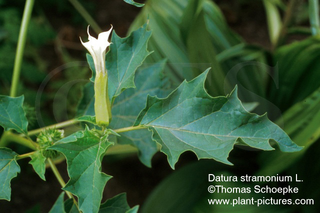 Stammpflanze: Datura stramonium L. / Gemeiner Stechapfel, Asthmakraut [Fam. Solanaceae / Nachtschattengewächse]. |